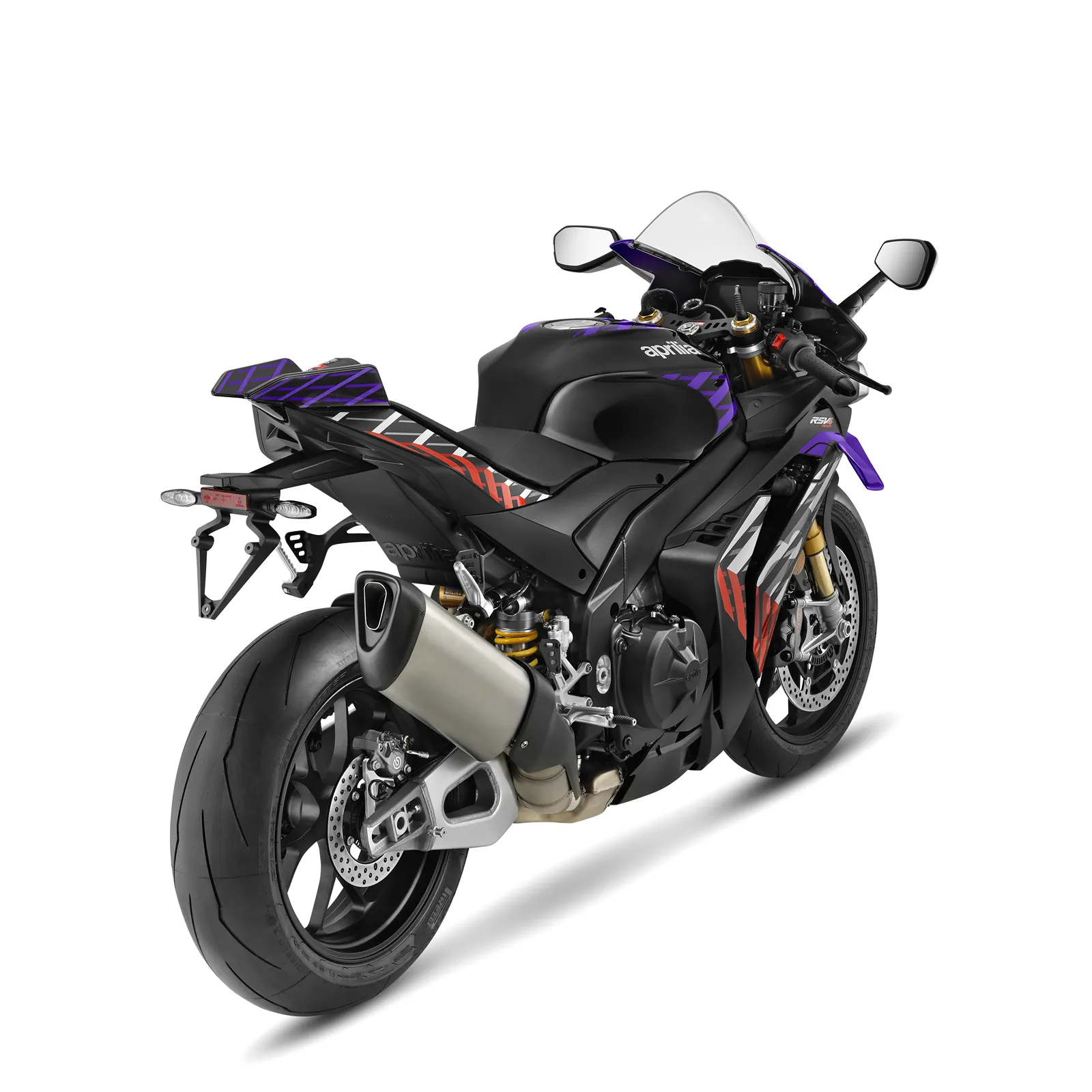 La Aprilia RSV4 Factory se distingue notamment par son équipement premium : suspensions Öhlins Smart EC 2.0 semi-actives, étriers de frein Brembo Hi-Pure et jantes forgées en aluminium ultraléger. Son aérodynamique sophistiquée, offre une réduction de traînée de 6%. En plus, le système d’éclairage Full LED avec fonction cornering garde sa signature visuelle distinctive.